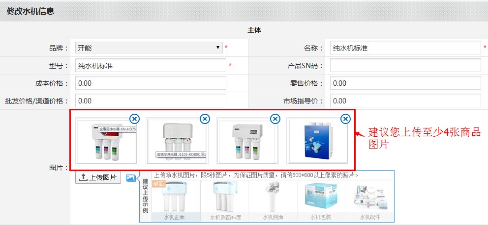 第二步:无论是添加还是编辑都会进入到下图页面,您可以将净水机产品的参数、报价、照片、和详细介绍等信息描述完毕并提交。