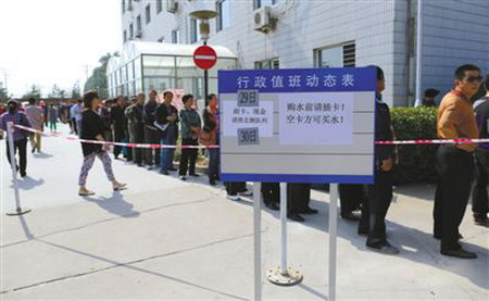 在兴润水务公司门前排队的市民,除了一部分是想赶在水价上涨前多囤一些“便宜水”外,还有一部分市民是由于银行昨日不能缴水费,水卡又快用完,于是加入买水大军。